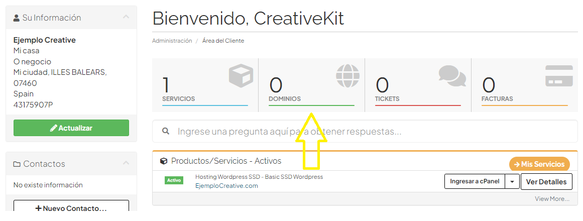 En el Área de Clientes de my.creativekit. Pulsar Dominios y después Mis Dominios  En la...