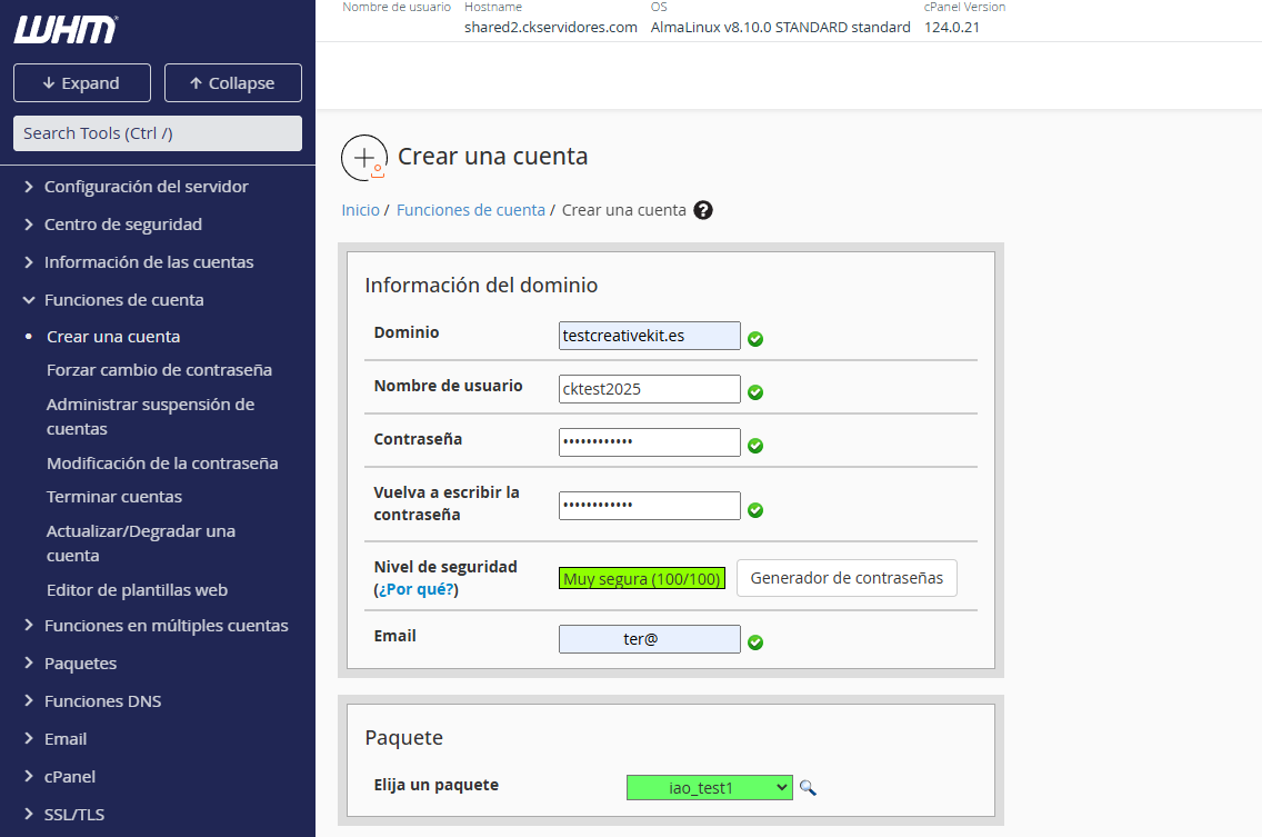 - ¡Y listo! Has creado una nueva cuenta en WHM.