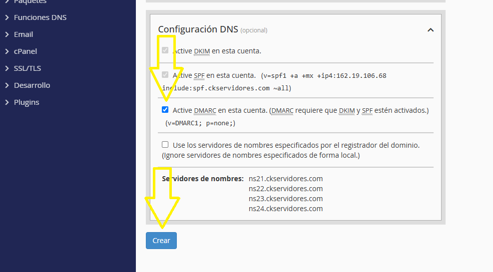 - Puedes dejar las opciones predeterminadas a menos que necesites configuraciones DNS específicas (importante asegurar-se que incluya DMARC en la cuenta).