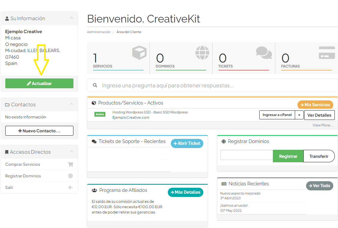 1. Pulsar el botón de Actualizar situado en la parte izquierda del Área de Clientes.